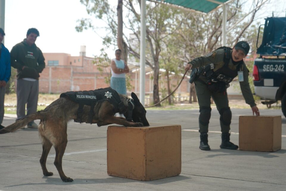 Jesús María, Ags.-El Grupo de Operaciones Especiales K9 de Jesús María realizó una demostración en la Telesecundaria Número 67, donde estudiantes tuvieron la oportunidad de conocer de cerca el trabajo, disciplina y entrenamiento de los binomios caninos.