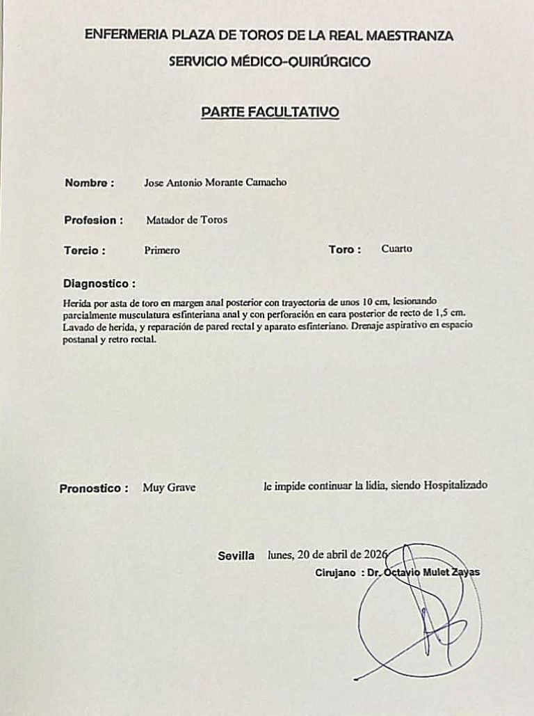 España.-El torero José Antonio Morante de la Puebla fue intervenido quirúrgicamente en la enfermería de la plaza de toros de La Real Maestranza de Sevilla, luego de sufrir una cornada en el recto en el décimo festejo de la Feria de Abril.