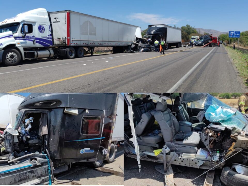 Aguascalientes, Ags-. Un fuerte accidente múltiple dejó como saldo a dos personas gravemente heridas al chocar dos triaileres por alcance y una camioneta sobre el libramiento sur.